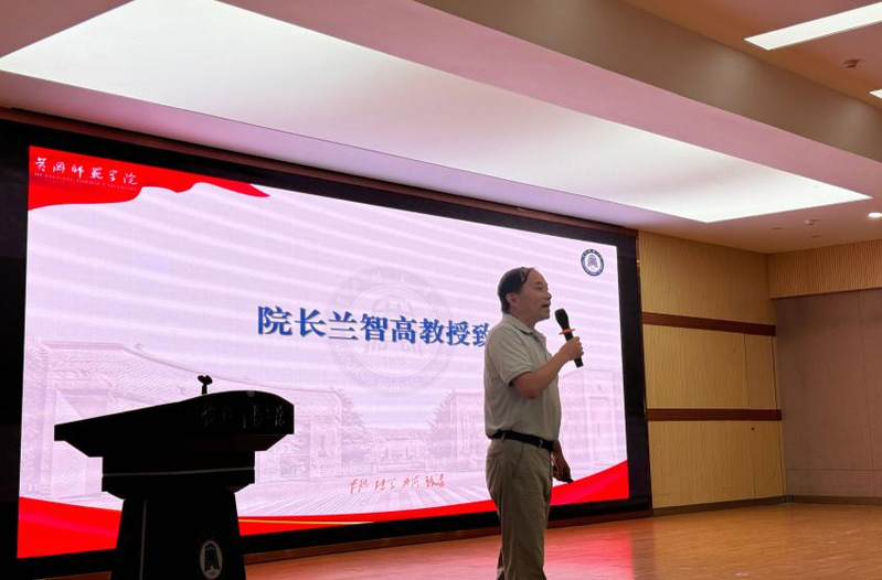 国歌毕,学院院长兰智高教授发表题为《追求卓越,做最好的自己——我的大学我做主》的讲话。兰院长在讲话中,回顾了必赢网络游戏平台百余年的办学历史与辉煌成就,并向与会人员介绍了学院在物理学、电子信息工程、光电信息科学与工程等专业的建设成果与师资力量,勉励新生深刻理解专业内涵、明确发展方向。兰院长强调大学生自律的重要性,提醒同学们合理安排时间、理性使用手机、树立正确消费观,做有目标、有规划、有担当的新时代大学生。他鼓励大家结合社会需求与个人特长,制定科学的大学四年规划,积极参与学科竞赛、科研创新与社会实践,不断提升专业能力与综合素质,以扎实的专业知识、创新的思维能力,在物电领域探索未知、追逐梦想。